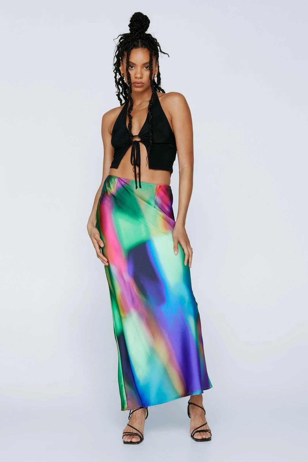 Skirt around it. Feel fierce when you step out in our bias maxi skirt, with high quality satin and a colorful abstract print that will turn heads as you strut the streets. Pairs well with a crop top and heels and will take you seamlessly from day to night.