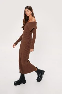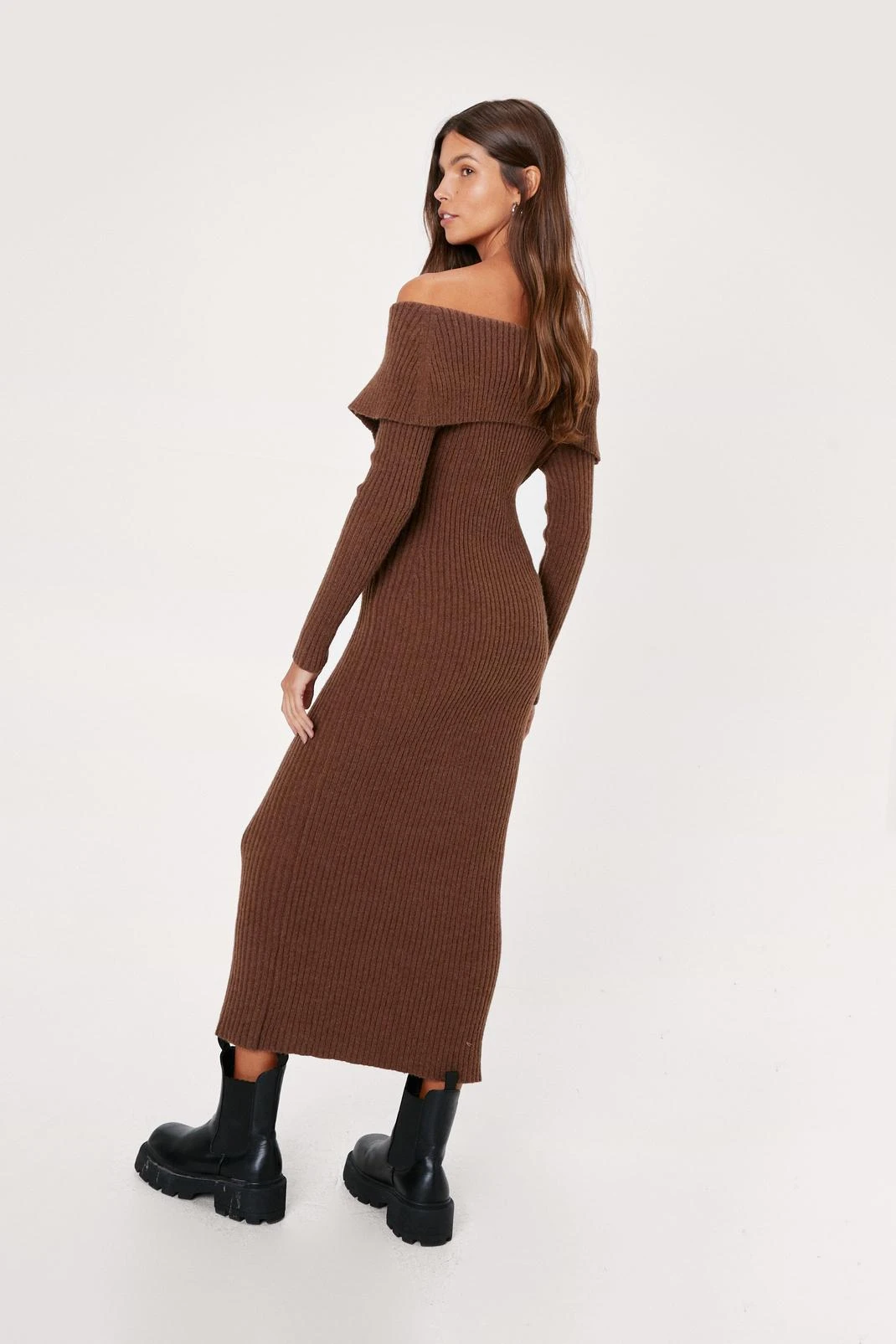 - Style: Bardot Fold Over Ribbed Knitted Midi Dress