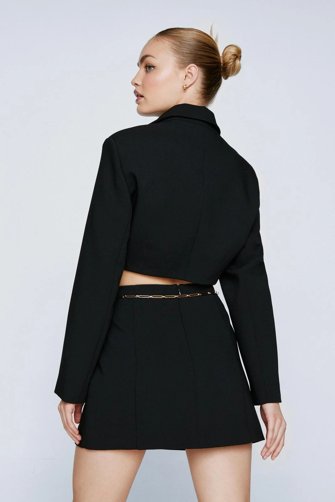 Chained together. Give a little edge in our chained cropped blazer, styled with the matching mini skirt.