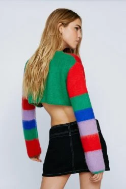 Block it out. Our colorblock cardigan will have you feeling bold, with its cropped length and knitted fabric. Pairs well with skirts and boots for the perfect cold weather look.