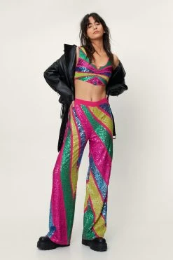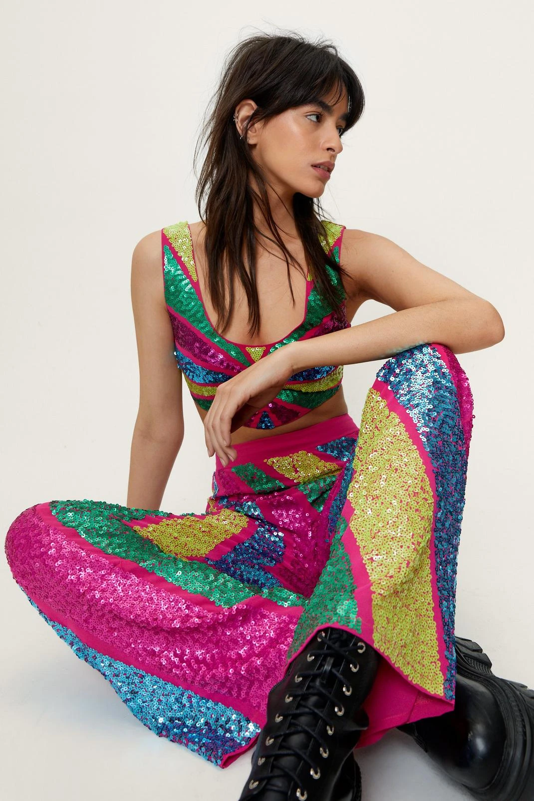 Disco inferno. Style with matching flared pants, faux leather jacket, and chunky boots