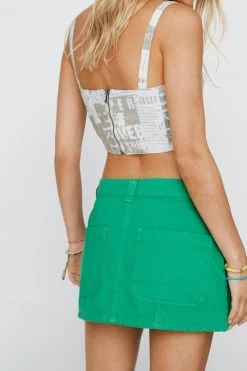 Runway rebel. Style this low waisted mini skirt with a belly chain, a slick back bun and a graphic tank top.