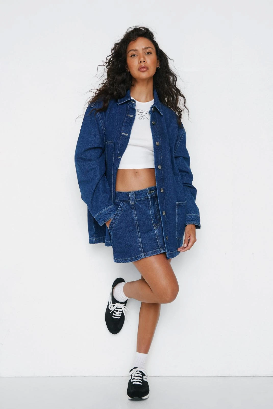 Runway rebel. Style this low waisted mini skirt with a belly chain, a slick back bun and a graphic tank top.