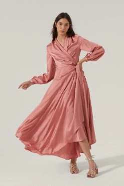 Or don’t. This dress comes in satin and features a wrap design, tie closure at side, maxi silhouette, and pleats at skirt.