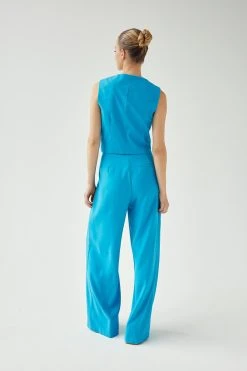 Suit season. This vest comes in a lightweight woven fabic and features a sleeveless design, tailored, cropped sillhoutte, V neckline, and tortoiseshell button down closures. Team yours with the matching wide leg pants and chunky sneakers. Item sold separate.