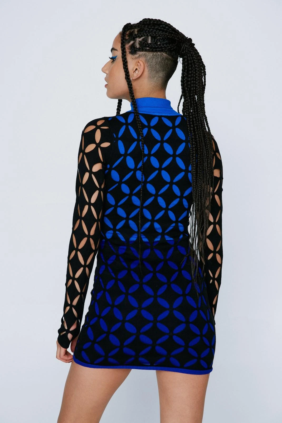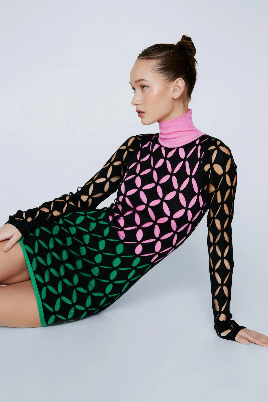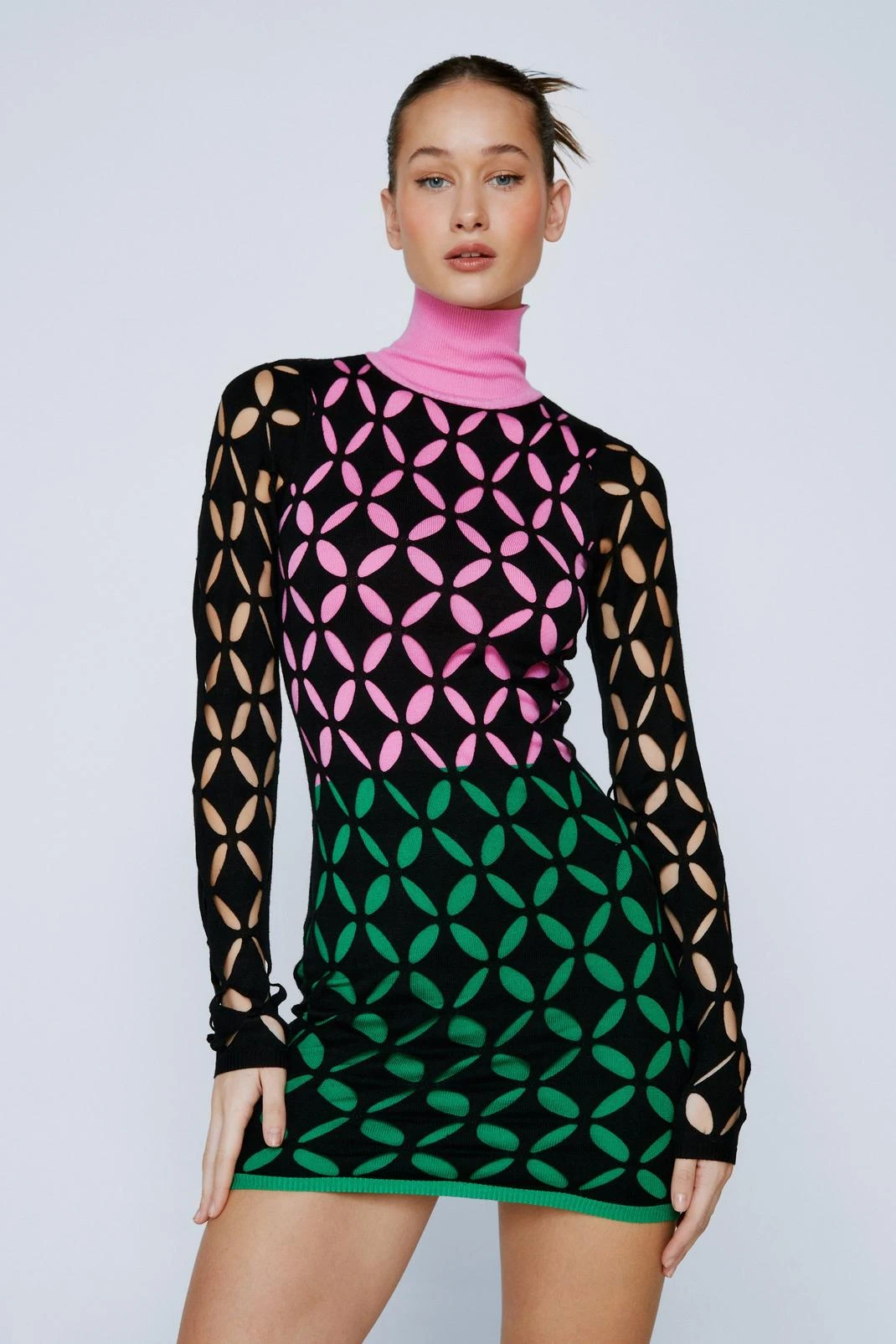 Elevated staples. Feel ready for the day – or night – ahead with our knit mini dress. Made in high quality knit fabric, with a colorful geometric pattern, ultra colorful underlays, and a high roll neck, this dress can easily be paired with boots or chunky heels for a look that will take you seamlessly from day to night. Perfect for dinner dates and drinks, happy hours, and casual parties.