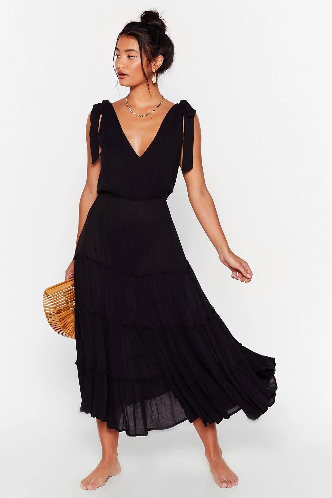 With shady beaches. This dress features a V-neckline at front and back, relaxed, midi silhouette, straps with bow tie closures, and tiered, ruffle detailing at skirt.
