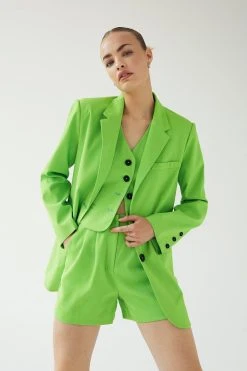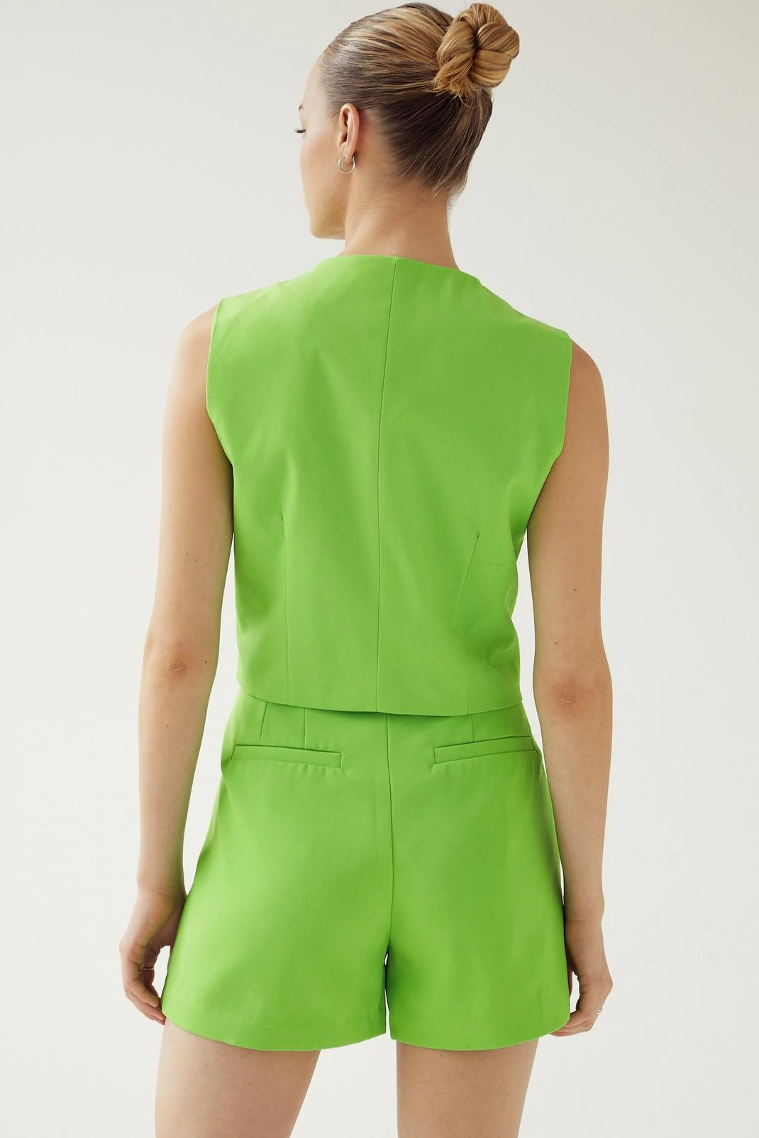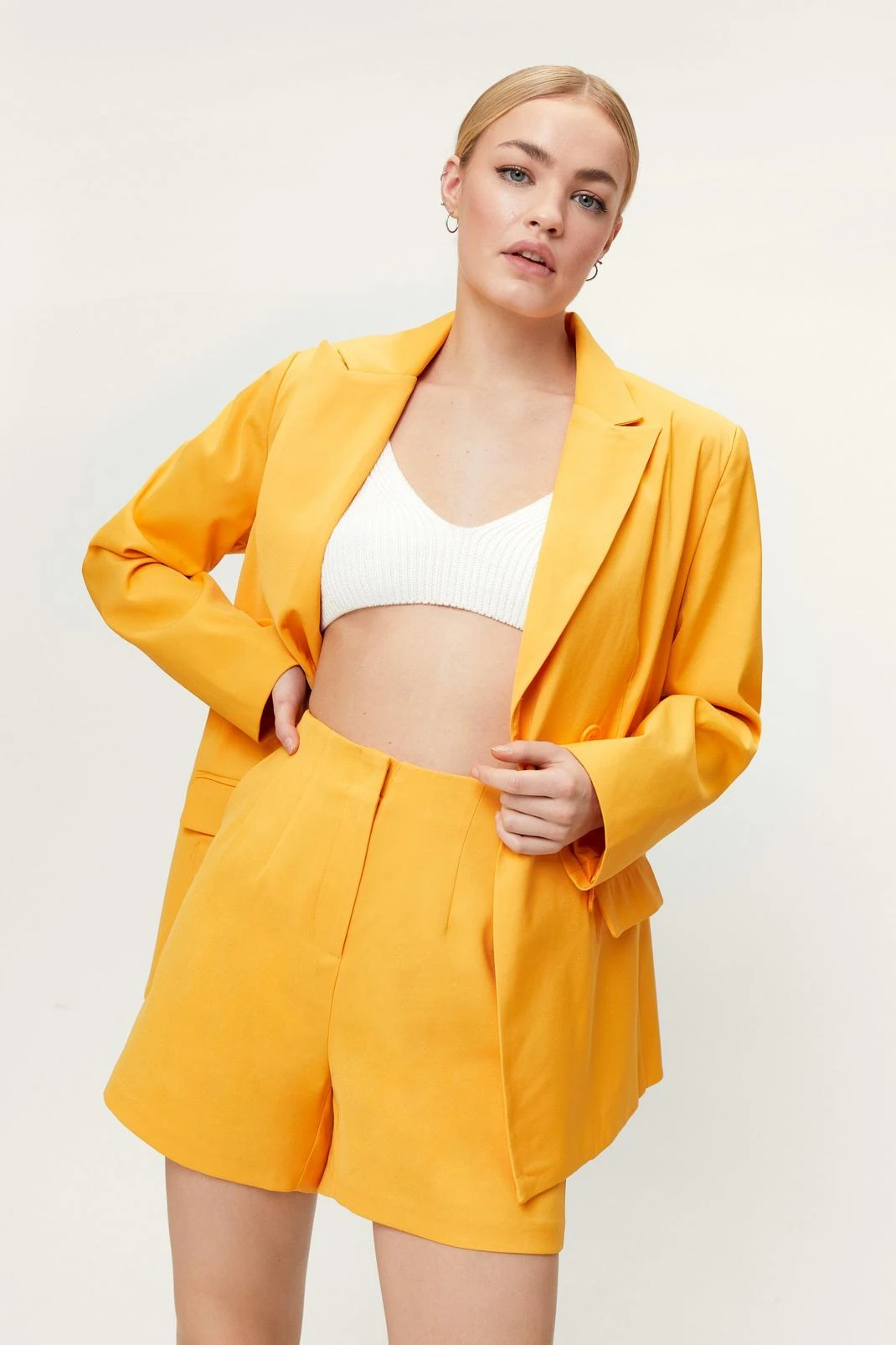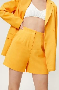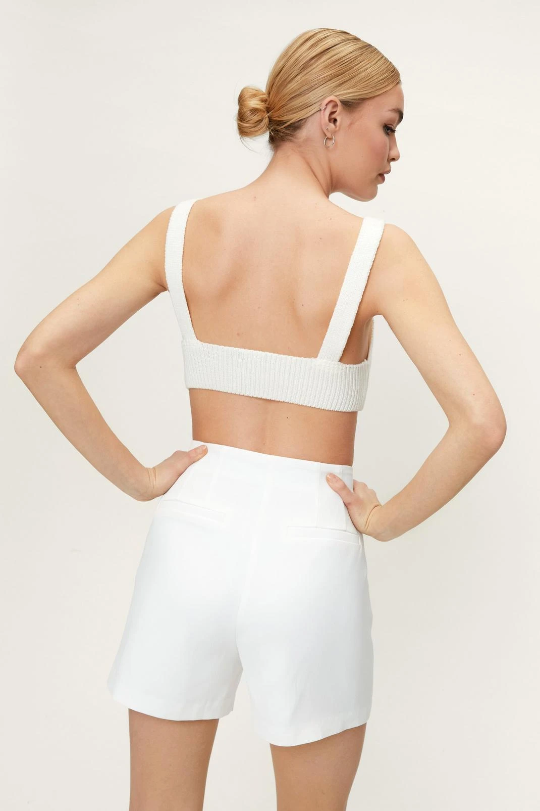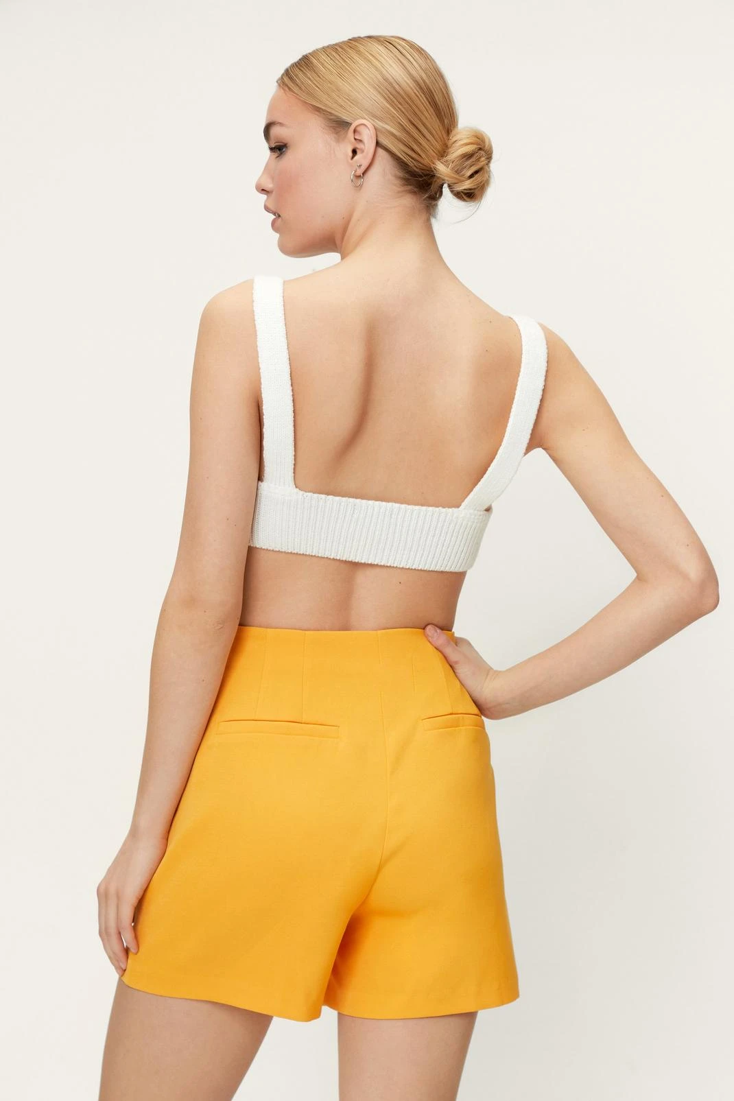 Suit up smart. These high waisted shorts come in a woven material, and feature a tailored silhouette that flares at the thigh, concealed zip down fly closure, dart detailing, and decorative pockets at back. Go full-on chic and pair with a matching oversized blazer, simple bralette, and fresh chunky sneakers. Item sold separate.