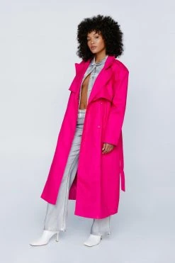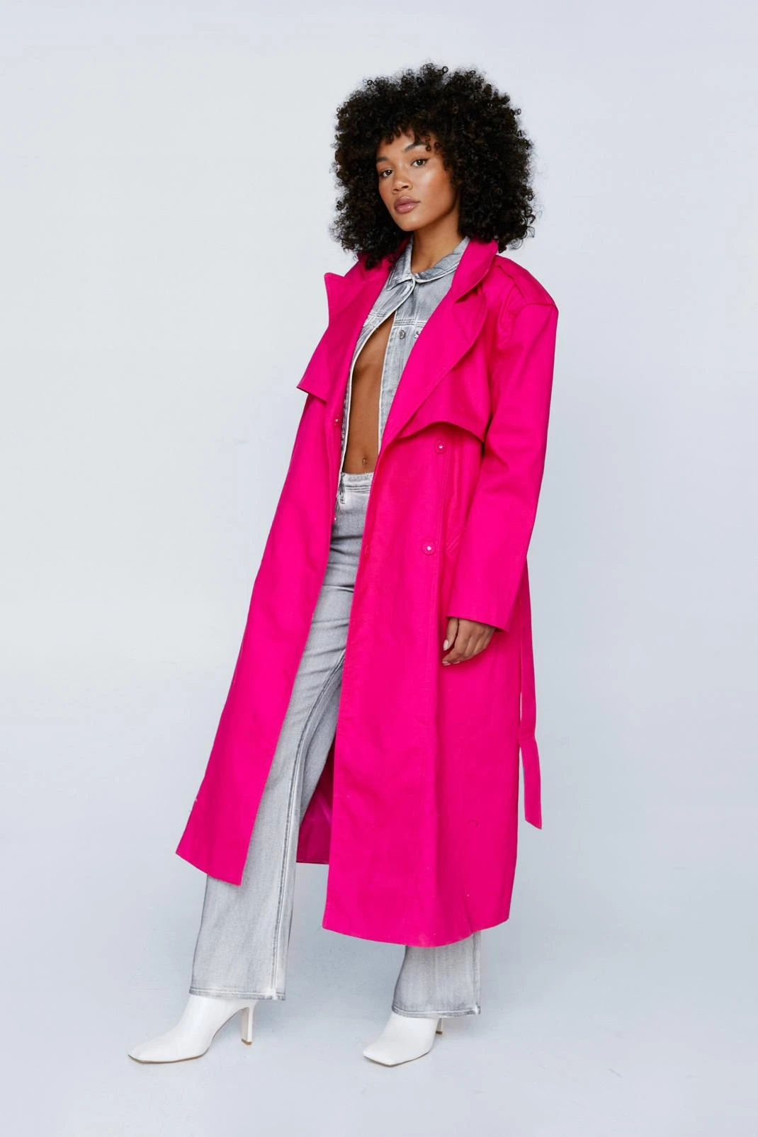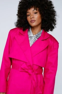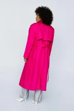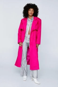 Add a layer. Feel elevated when you throw on our trench coat, with a belted waist for a stellar silhouette, statement shoulder pads, and a traditional trench coat design which is contrasted by the unexpected colorway. Pairs well with your fave daytime looks to instantly step it up, and easily go from day to night, as a longline coat always elevates a look.