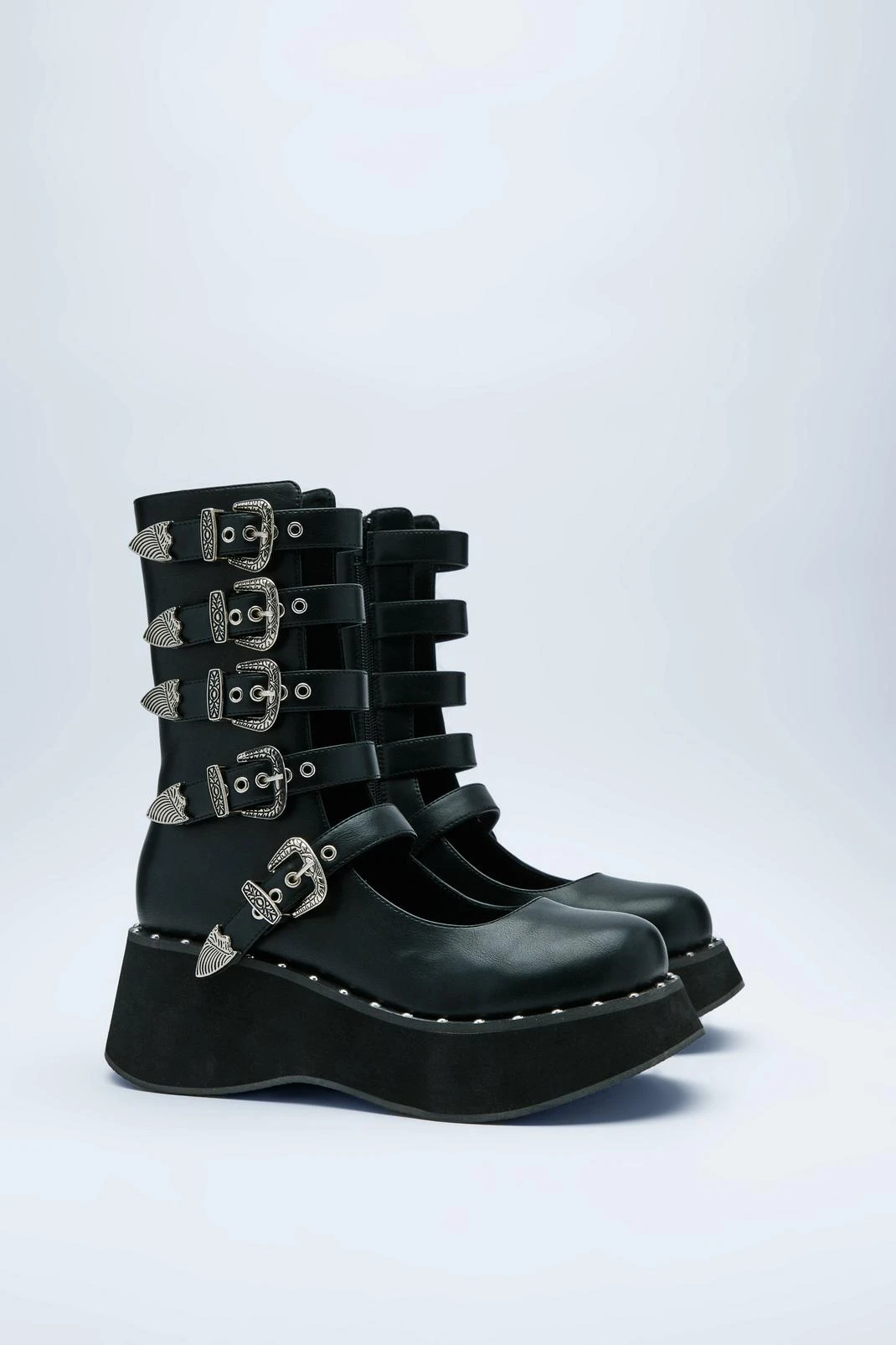 Step it up. Feel edgy in our ankle boots, made in a high quality faux leather, with buckle detailing and chunky platform soles. Pairs well with dresses and skirts, or can be worn under jeans for an instantly elevated look.