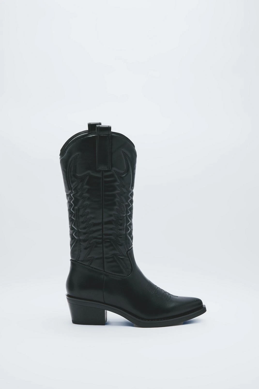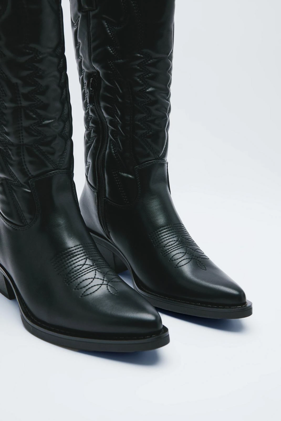 Made for walking. Step out in our faux leather cowboy boots, with traditional pointed toes and embroidered detailing. Pull tabs and an inner ankle zips make them ultra easy to pull on, and the knee high length makes them the perfect statement shoe to elevate your everyday outfits.
