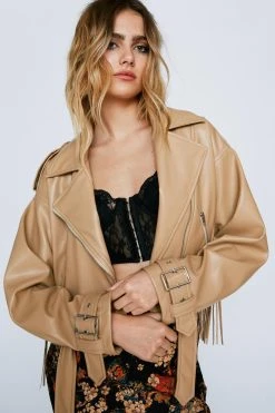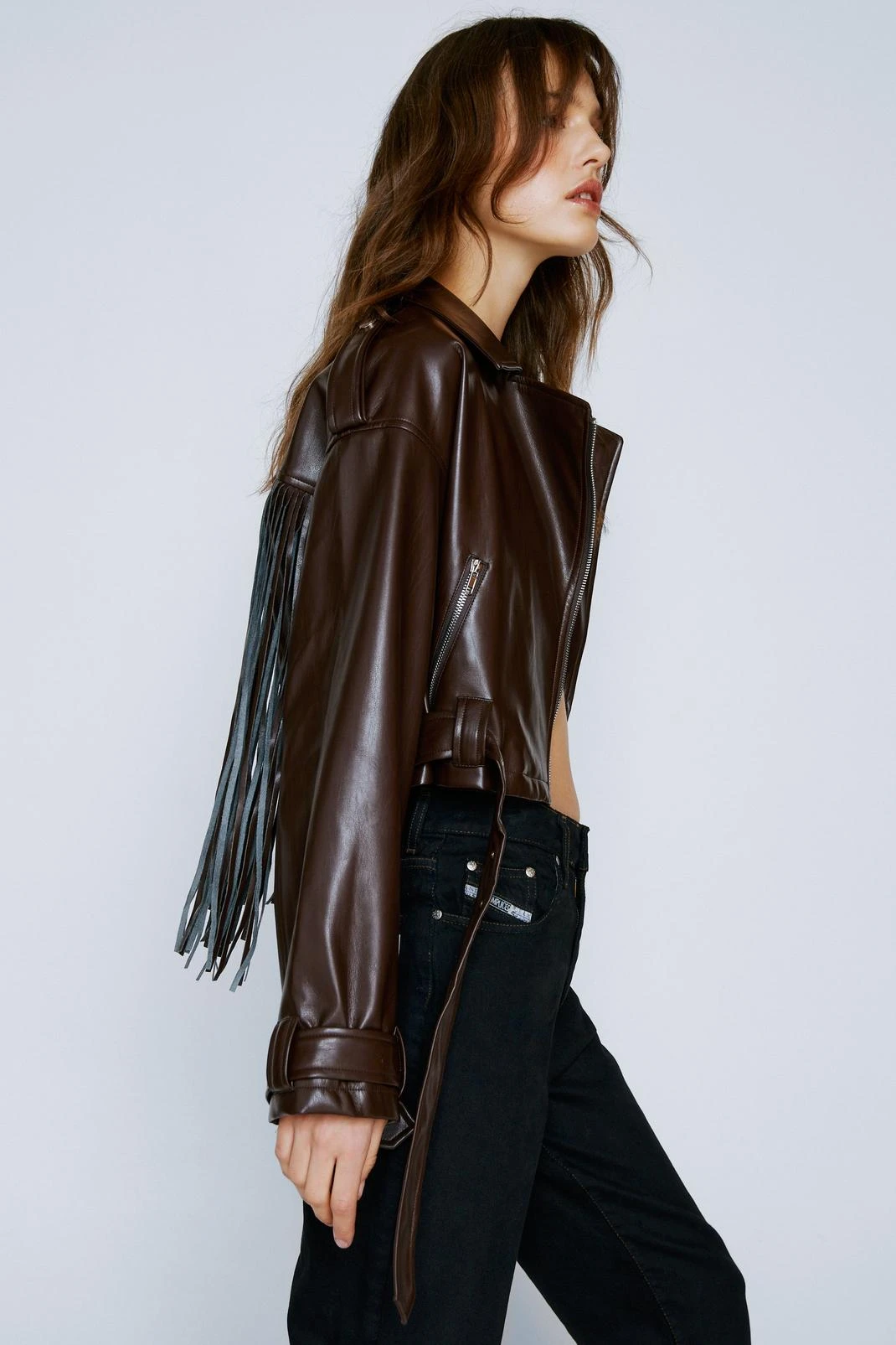 Pleather please. Feel protected from the cold without compromising on style in our faux leather jacket, with long fringe detailing for fun movement and a cropped length for an edgier approach. Pairs well with a crop top and jeans.