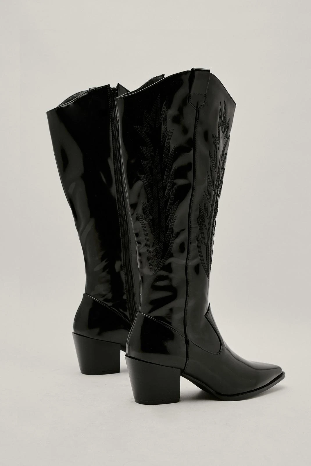 Easy there, cowboy. These western-style boots come in flexible faux leather and feature a knee-high silhouette, pointed toe, flat sole, slanted heel, western-inspired embossed design throughout, heel pull tabs, and inside zip closure. For a dialed-down look, pair yours with your favorite skinny denim jeans and a chunky cable knit sweater.