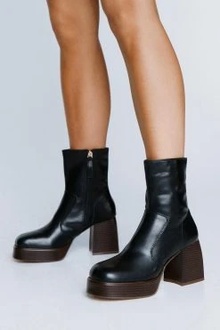 Fancy footwear. Feel confident when you step out in our chunky boots, with high quality faux leather fabric, statement chunky heels, and unique wood effect sole. Pairs well with jeans or skirts for an elevated look that will take you seamlessly from day to night, whether you’re going for dinner and drinks or happy hour and nearby dancefloors.