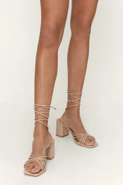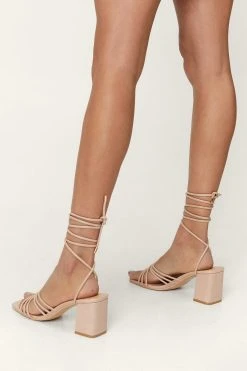 Wrap it up. These heeled sandals feature a strappy wrap design, block heels, and square toes. Team with a slip mini dress and denim jacket for a date to the cinema.