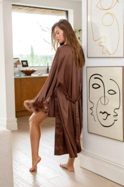 Slip into something more comfortable. Our feather trim satin robe is perfect for adding some glam to your evening and morning routine, and for layering up as the cold weather rolls in.