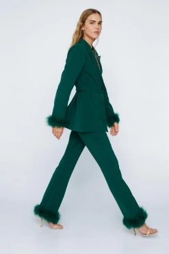 Ruffle some feathers. Our flared pants with feather trims can be styled with the coordinating blazer and strappy heels for party season and beyond.