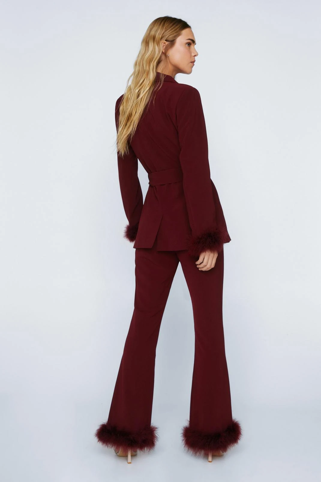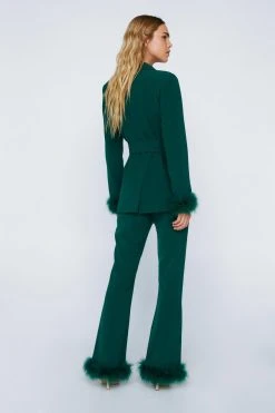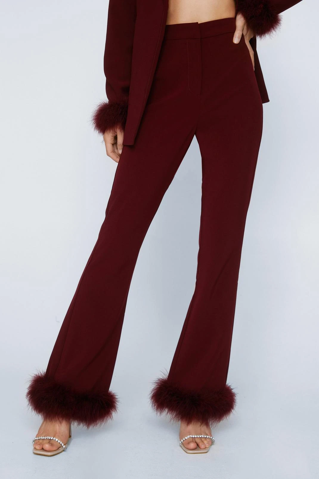 Ruffle some feathers. Our flared pants with feather trims can be styled with the coordinating blazer and strappy heels for party season and beyond.