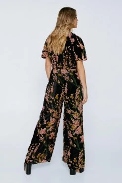 Bring flowers. Feel as good as you look in our floral devore jumpsuit, with angel sleeve detailing and a wide leg design. Pairs well with chunky heels and dinner plans.