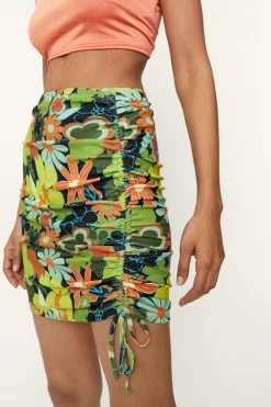 Flower power. Feel cute in our mini skirt, with a fun floral pattern,and ruched sides for a custom fit. Pairs well with crop tops and a bomber jacket for a day out look that you’ll keep coming back to.