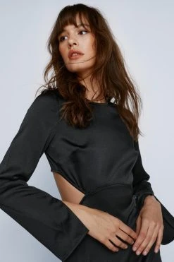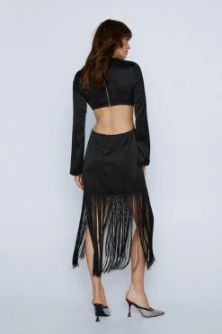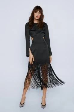 Swish around. Our fringe satin column dress is a playful addition to your formal wear options.