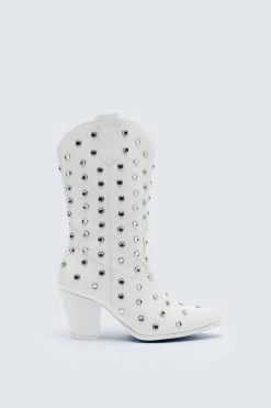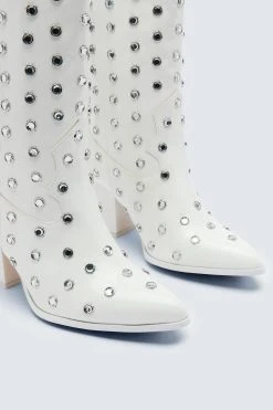 Step right up. Feel femme in our patent cowboy boots, with gem detailing that catches the light as you walk. The pointed toes and chunky heels offer a taste of the traditional, while the patent fabric and shimmering gem details adds a modern touch, making them super easy to style with anything from mini skirts to jeans.