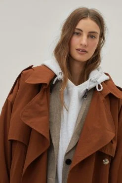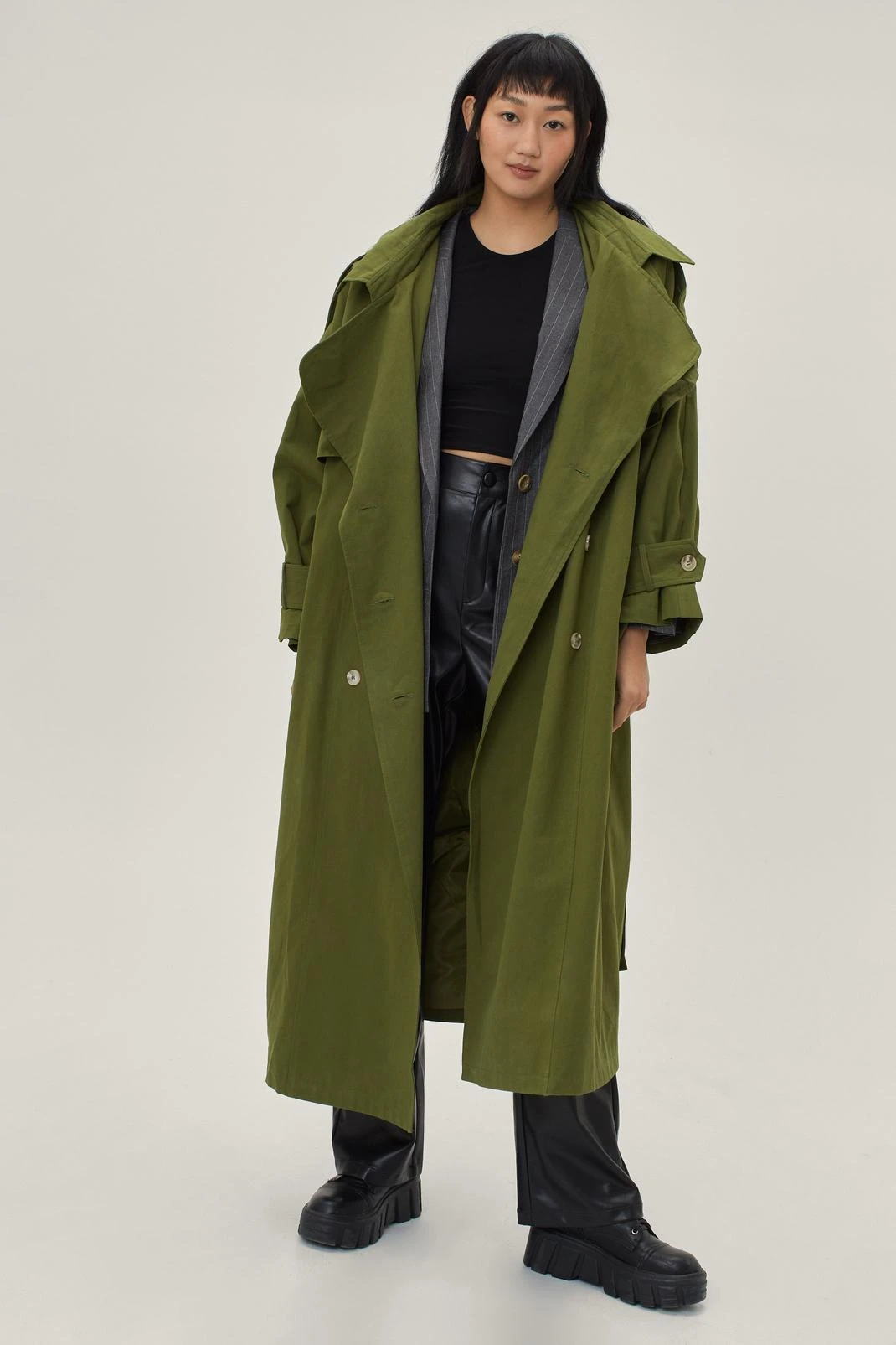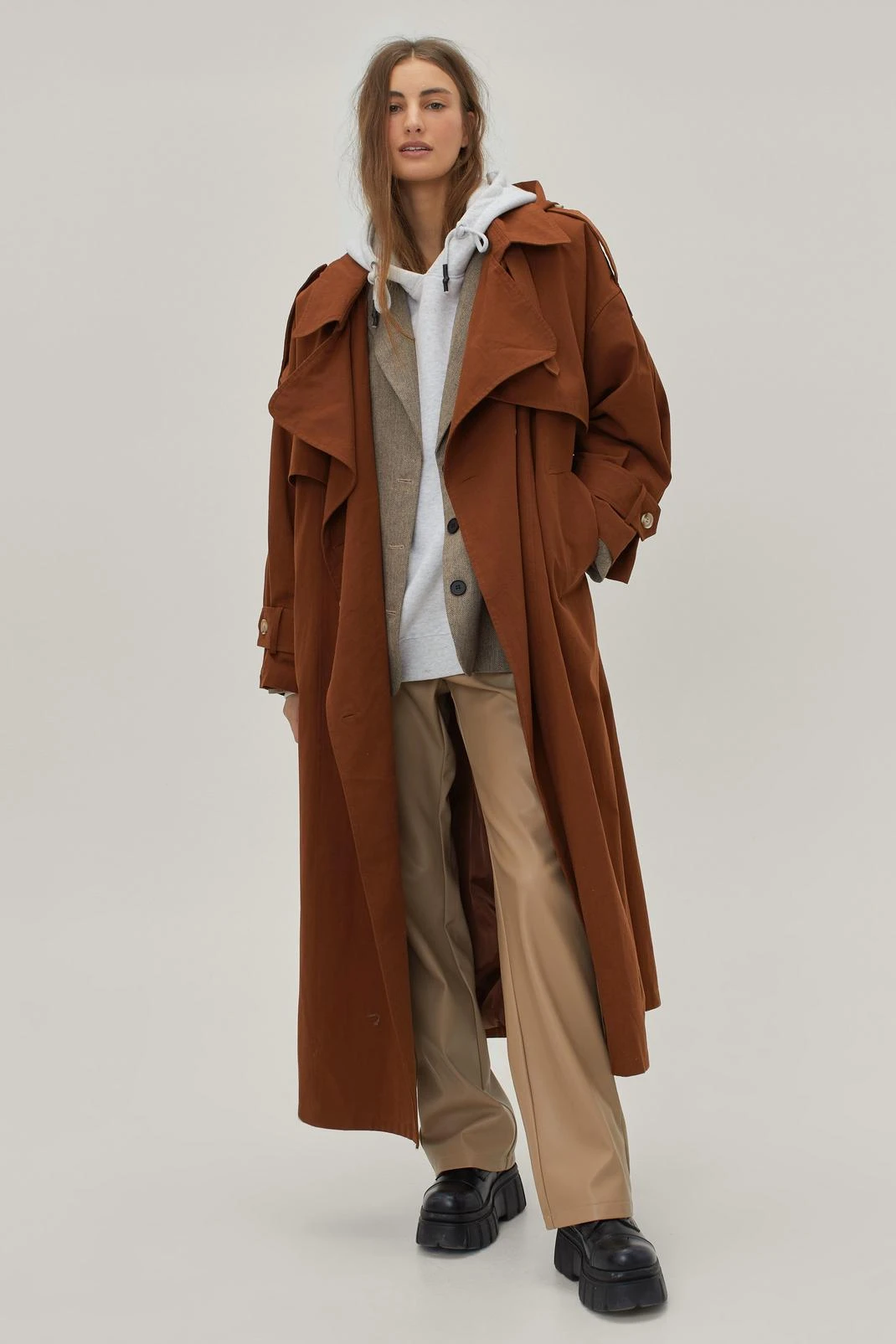 Am I the answer to your layers? This trench coat features an oversized, longline silhouette, V neckline, wide, notched lapels, drop sleeves with fitted cuffs, double breasted button closure, layered design at top, pockets at sides, tie belt at waist, and hood at back. Rad for throwing on over suiting sets, mom jeans and that 4 year old sweat set.