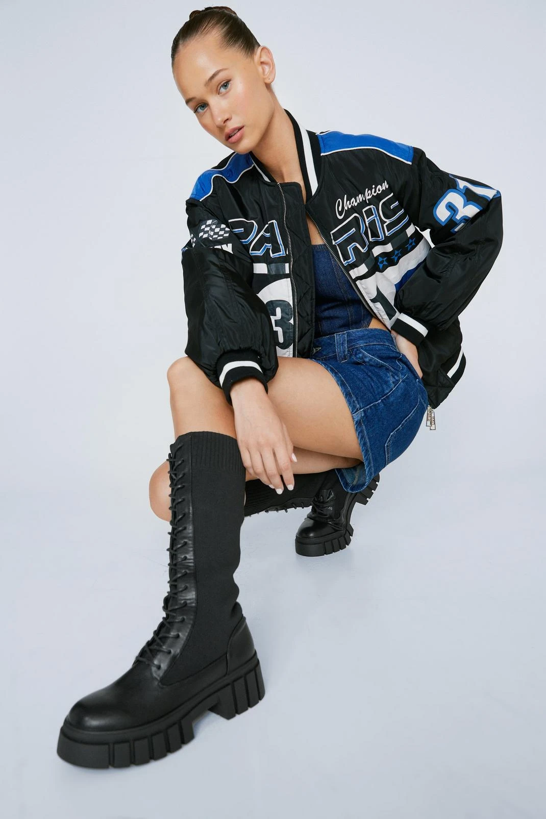 Stomping ground. These boots feature a slim-fitting design, chunky cleated heels, and lace up fronts.