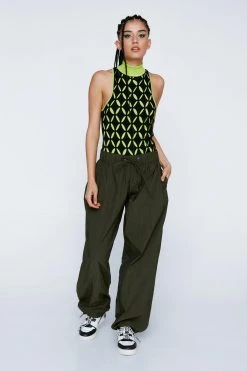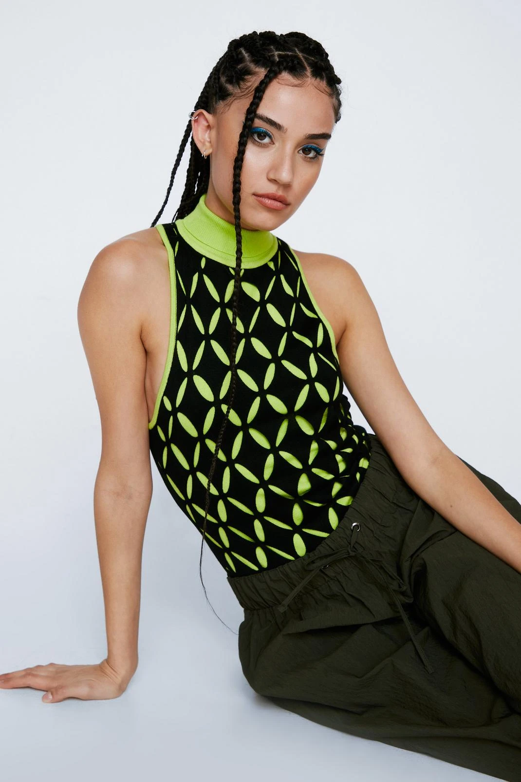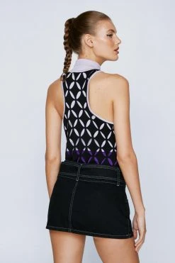Elevated staples. Feel ready for the day – or night – ahead with our knit bodysuit. Made in high quality knit fabric, with a colorful geometric pattern, a racer style back, and a high roll neck, this bodysuit can easily be paired with a skirt or leather pants for a look that will take you seamlessly from day to night. Perfect for dinner dates and drinks, happy hours, and casual parties.