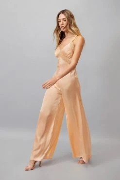 Instant outfits. Feel confident in our jumpsuit, with high quality satin fabric and feminine lace trim. The wide leg design accentuates the fitted bodice, creating a stellar silhouette and leaving you feeling as good as you look. Pairs well with strappy heels for an instant occasion look.