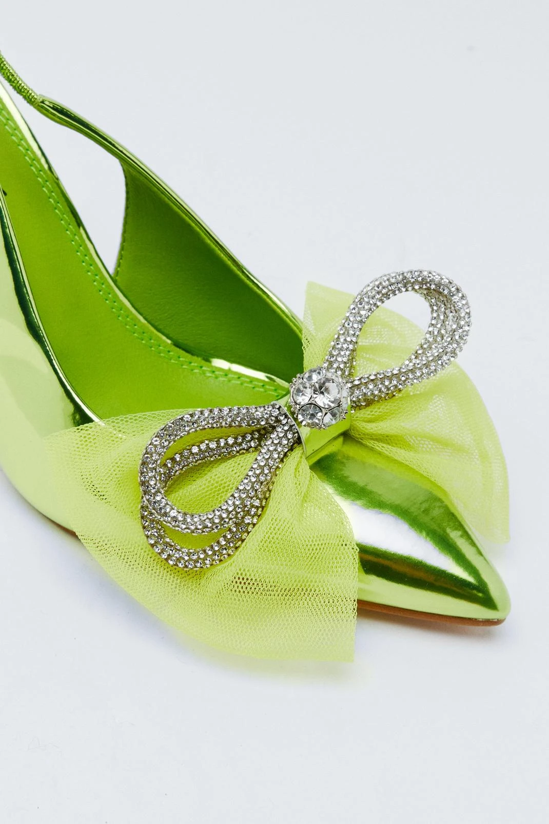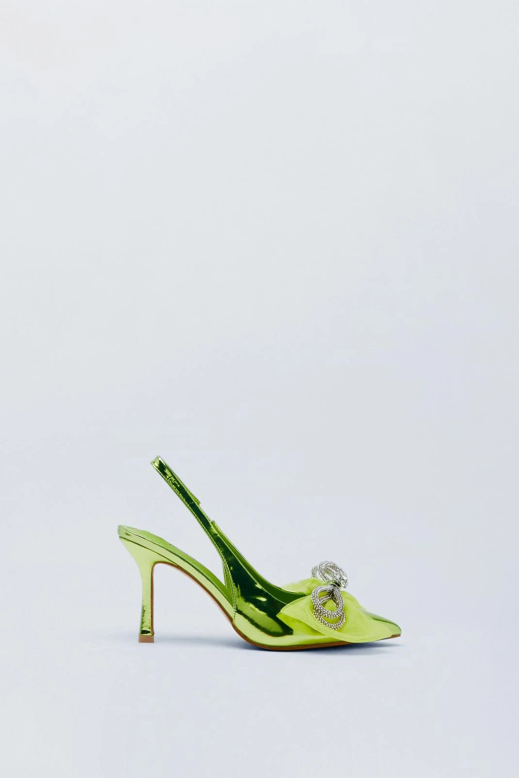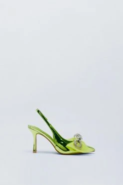 Step it up. Add flirty detail to your look in our sling back court heels with bow and diamante accents.