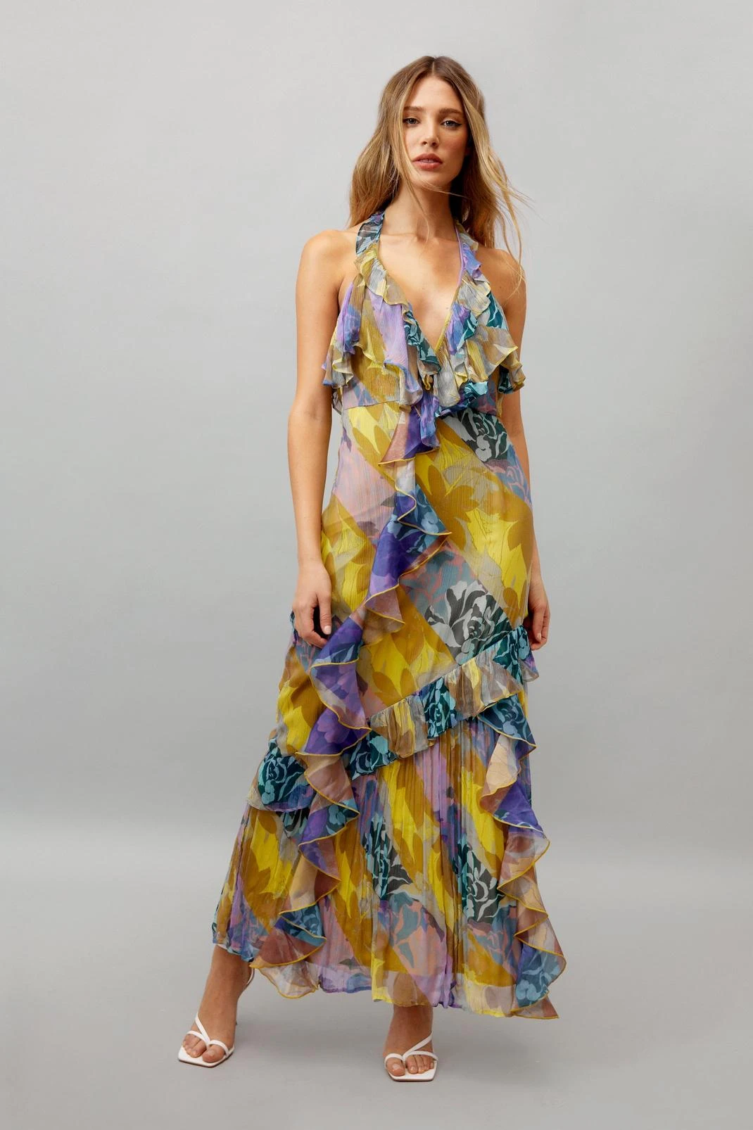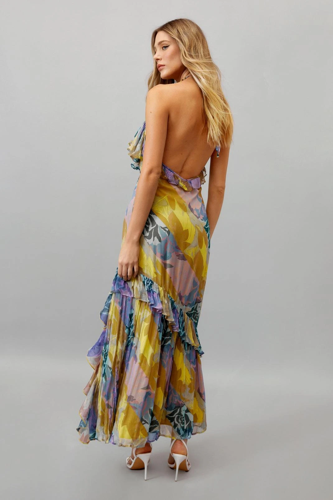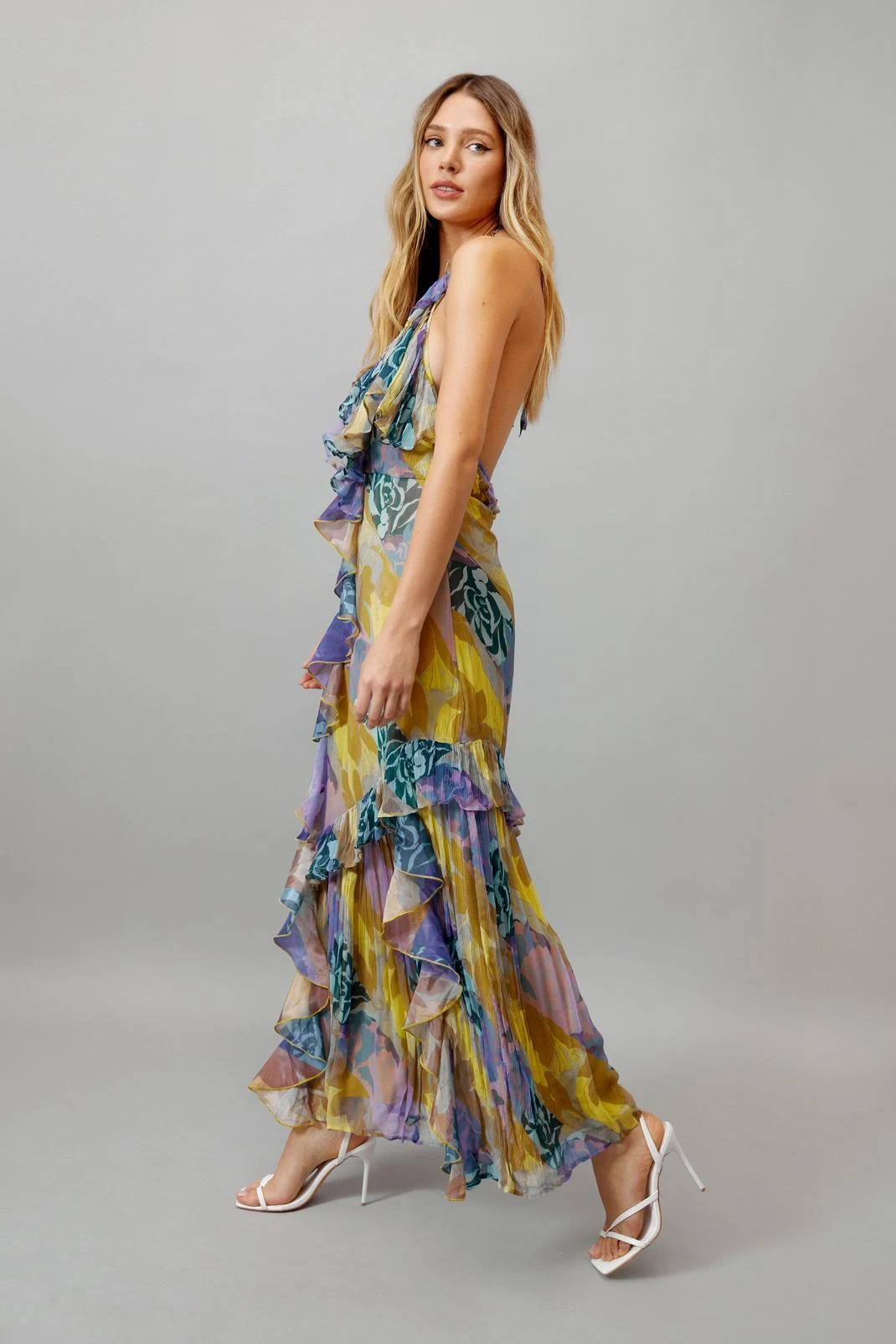 A moment for the dress. Feel confident when you step out in our maxi dress, with ruffle detailing for enchanting movement, a deep plunging necklace, and head-turning backless design. Pairs well with strappy heels for a summery occasion look that you’ll feel like the star of the show in.