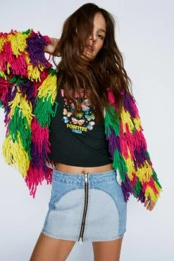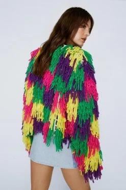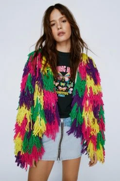 - Layer up. Feel cozy in our oversized cardigan, with an ultra comfortable, statement fringe design and a relaxed, open design. Pairs well with your fave daytime looks to add fun detail, whether you’re heading out for drinks, to a festival weekender, or to the office.