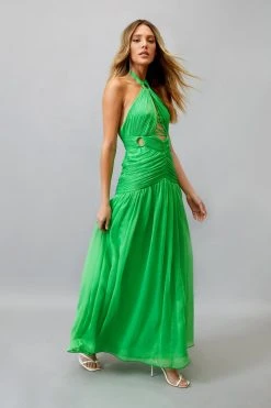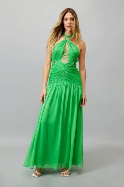 Steal the show. Feel fierce in our maxi dress, with a sexy lace up chest, O-ring detailing, a fitted bodice, flirty low back, and floaty skirt. Pairs well with strappy heels for an occasion look that you – and everyone around you – will be obsessed with.