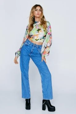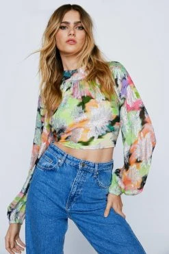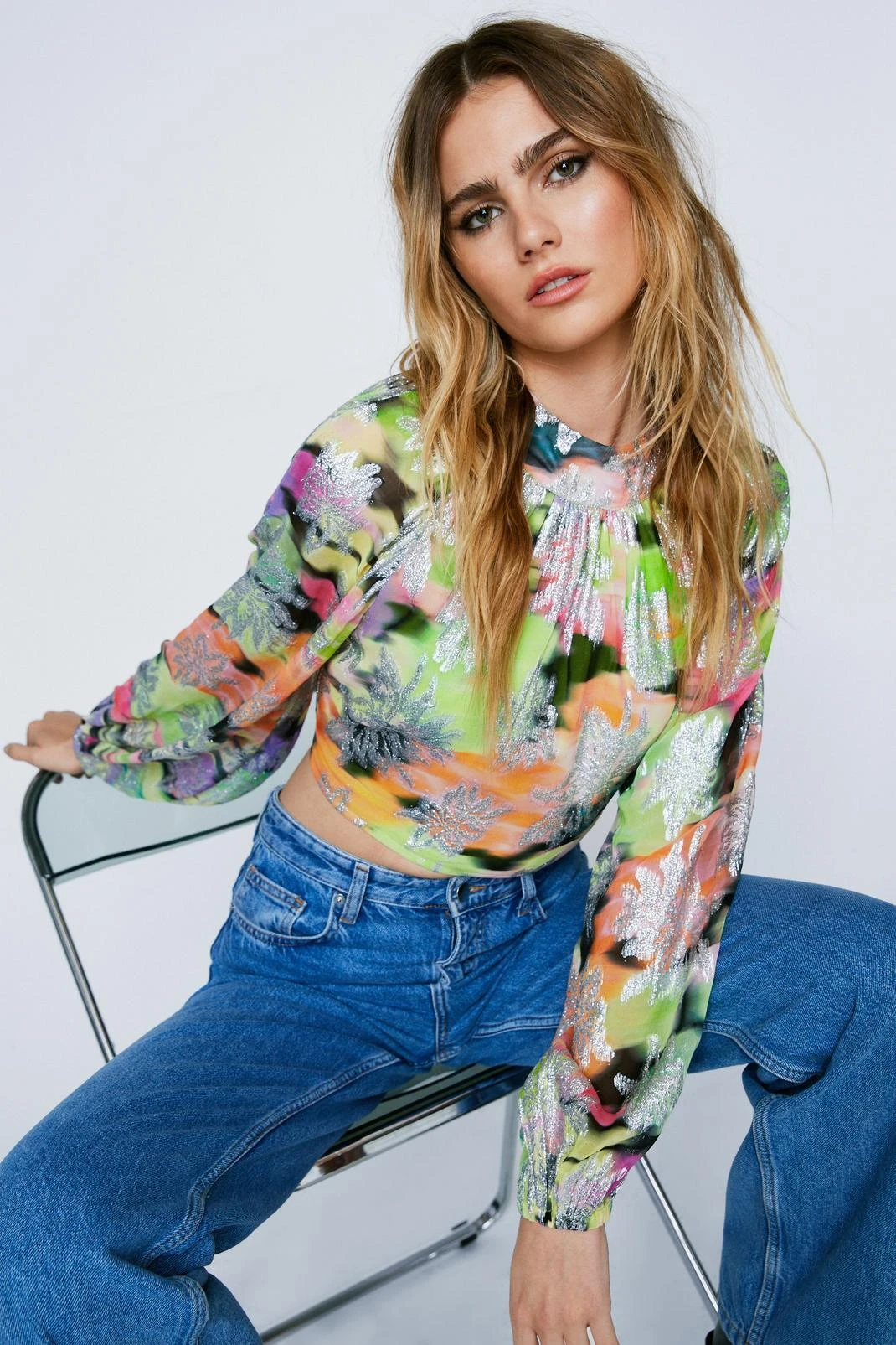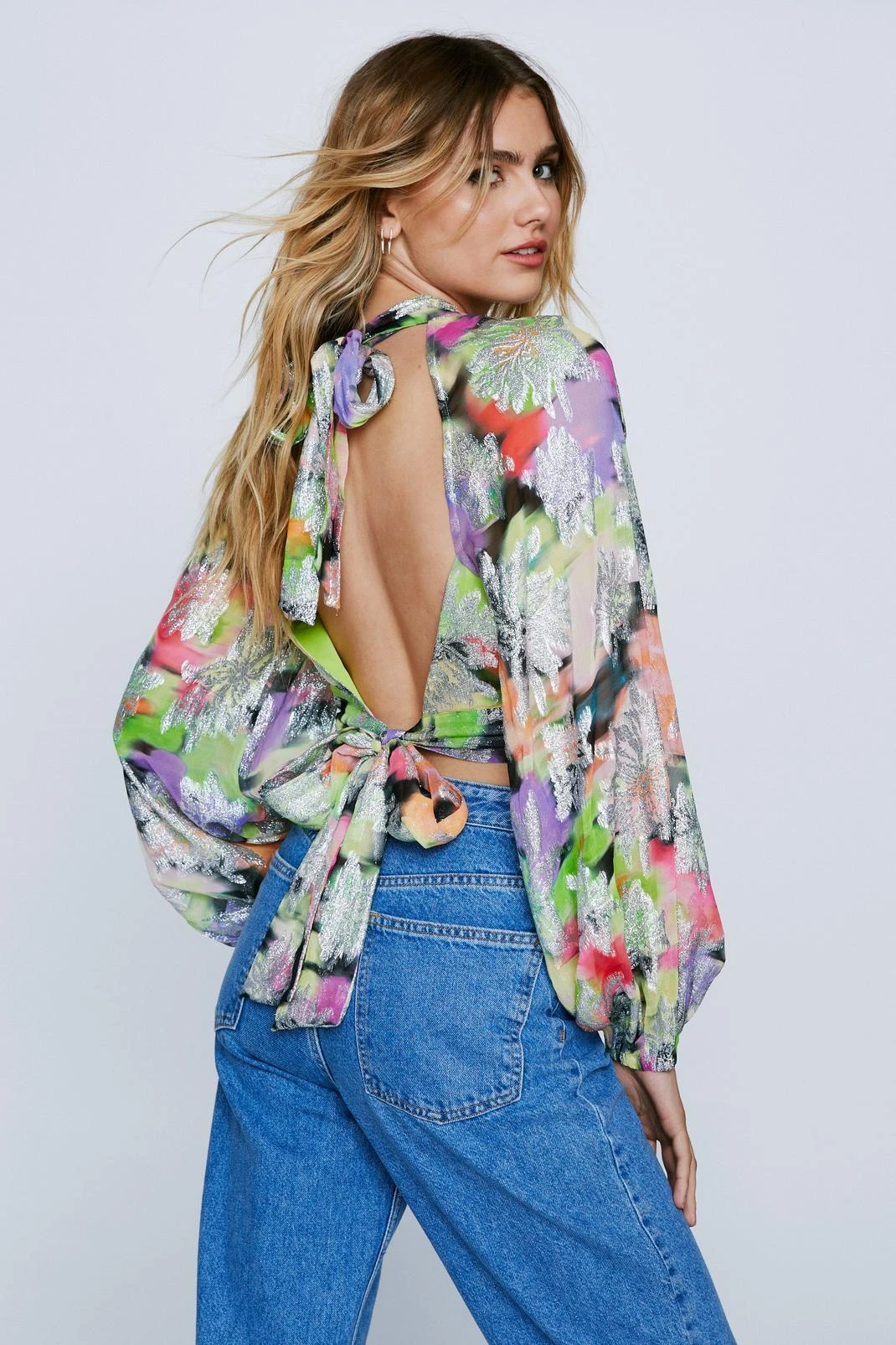 Top priority. Style our open back floral metallic top with jeans or leather pants for an elevated everyday look.