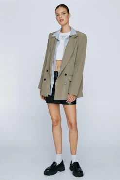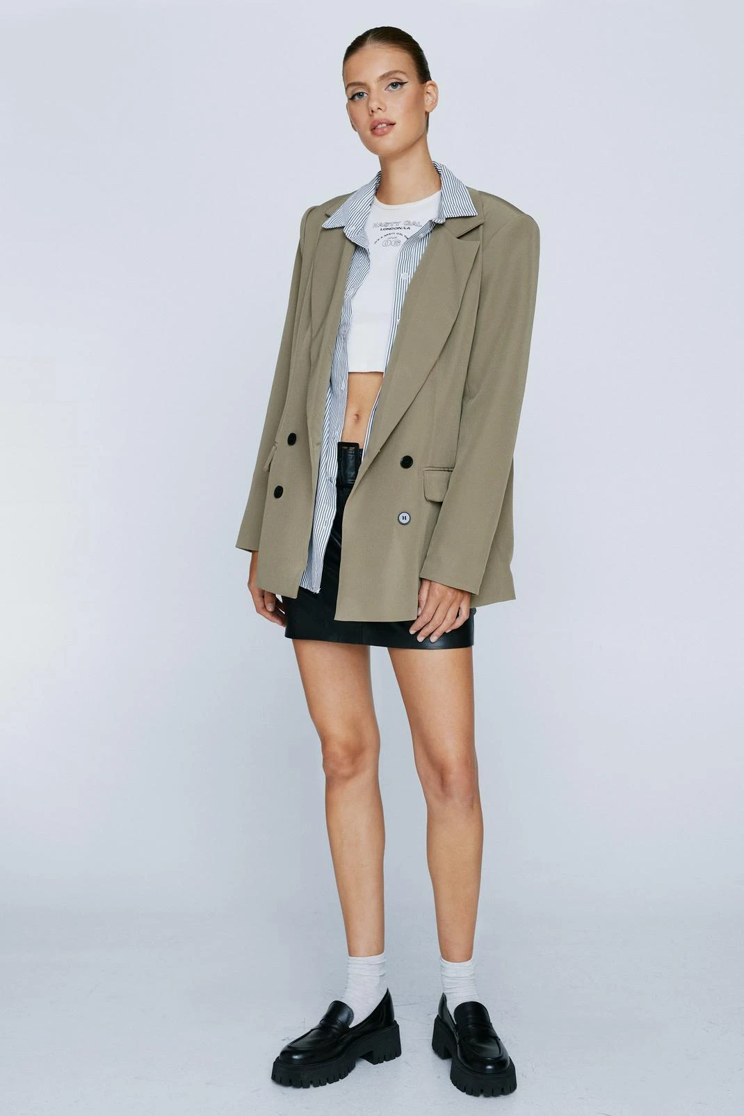 When business meets pleasure. This blazer features an oversized silhouette, padded shoulders, notched lapels, double breasted, button-down closures, and decorative flap pockets at front. Item sold separate.