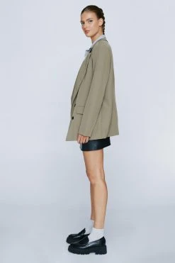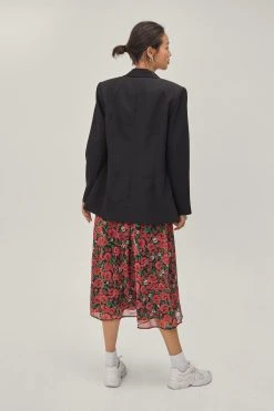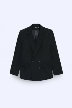 When business meets pleasure. This blazer features an oversized silhouette, padded shoulders, notched lapels, double breasted, button-down closures, and decorative flap pockets at front. Item sold separate.