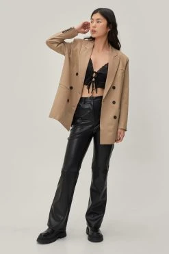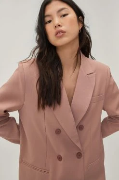 Suit up smart. This tailored jacket features an oversized, longline silhouette, padded shoulders, oversized, notched lapels, double breasted, button-down closures, long sleeves, buttoned cuffs, suit vent, and decorative front pockets. Goes well with matching tailored suit pants.