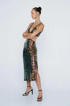 Wild nights pending. Feel fierce in our midi dress, made in high quality sequin fabric, with a fun zebra print and a sexy cut out design. Style with strappy heels for a look that will turn heads, whether you’re wearing it to prom night or to a party.