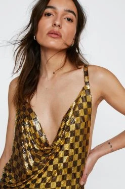 - Petite Chainmail Checkerboard Cowl Neck Mini Dress