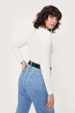 This bodysuit comes ribbed and features a high neck, fitted, high leg silhouette, long sleeves, cheeky bottom coverage, and snap closure at crotch. The kinda closet basic that’s always good to have around. Pair it will literally whatever.
