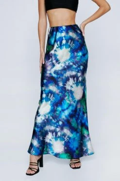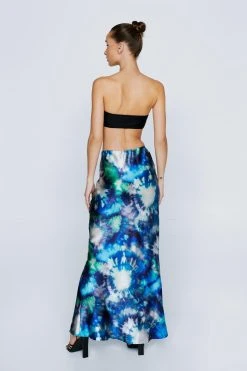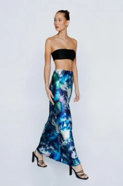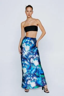 Skirt season. Style our petite tie dye satin maxi skirt with a bandeau or crop top and strappy heels for an elevated evening look.