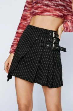 Skirt around it. Feel edgy in our mini skirt, with a classic pinstripe print, buckle detailing, an ultra flattering straight fit, and a comfortable high waistline. Pairs well with a crop top or corset top for an instant evening look, perfect for dinner dates, dancefloors, and drinks.