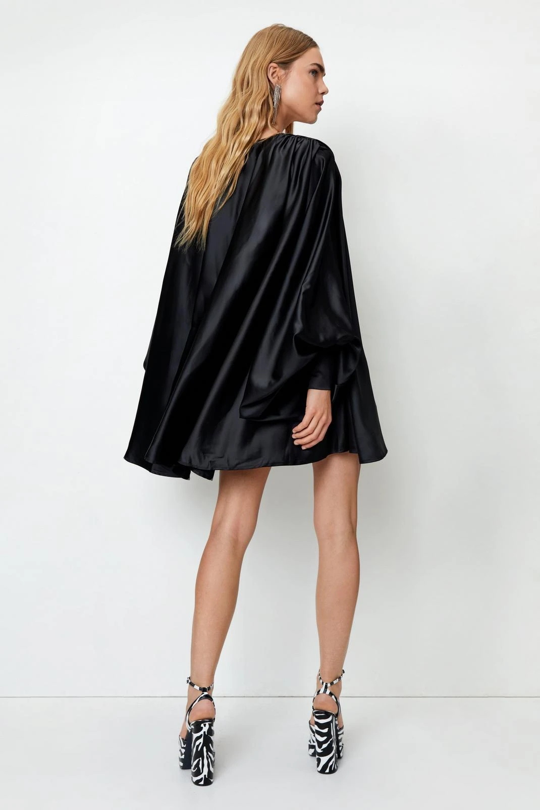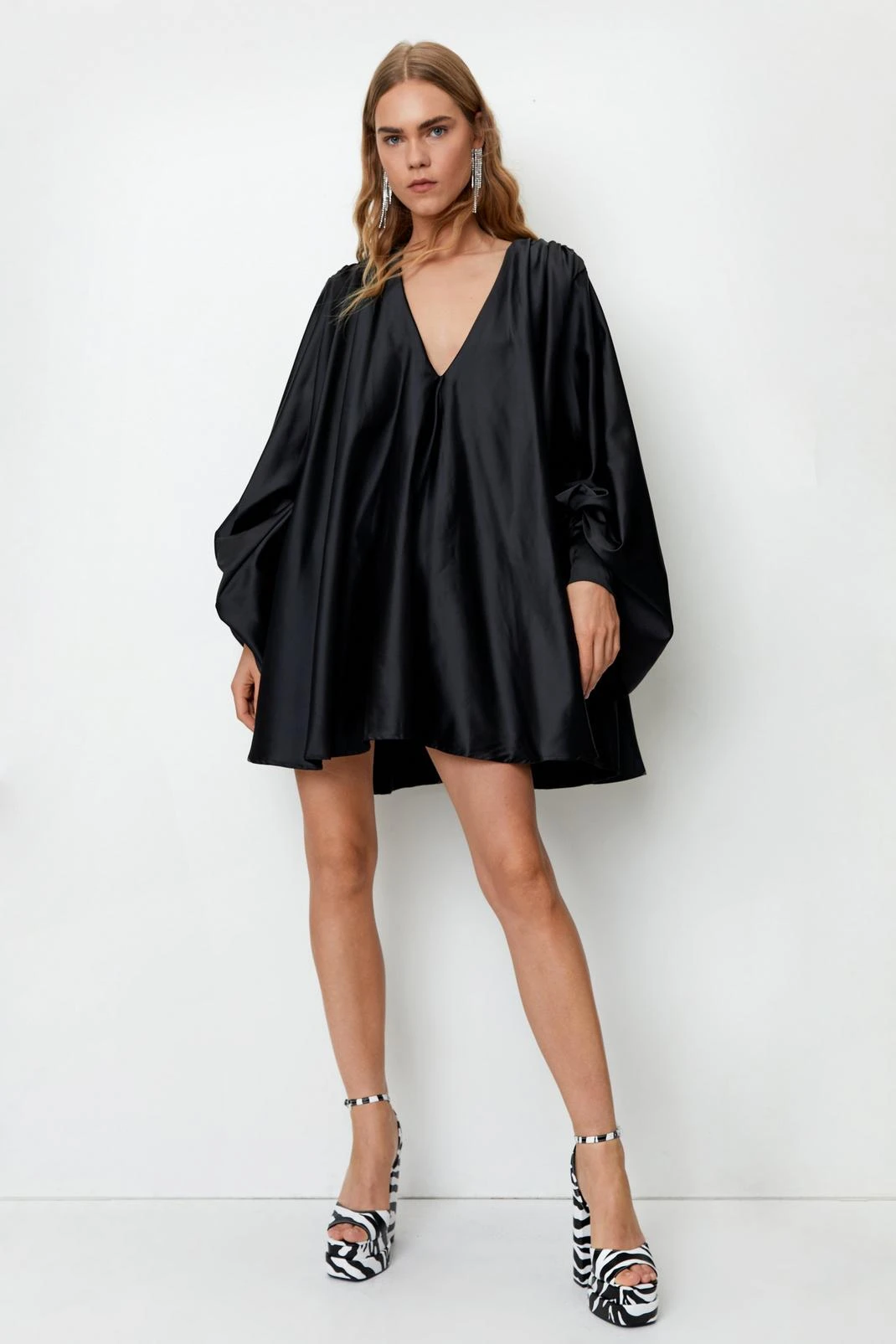That’s one way to make an entrance… This dress comes in satin and features a V neckline, oversized, mini silhouette, and balloon, batwing sleeves. Great when styled with chunky biker boots or strappy heels for partying your way through the season.
