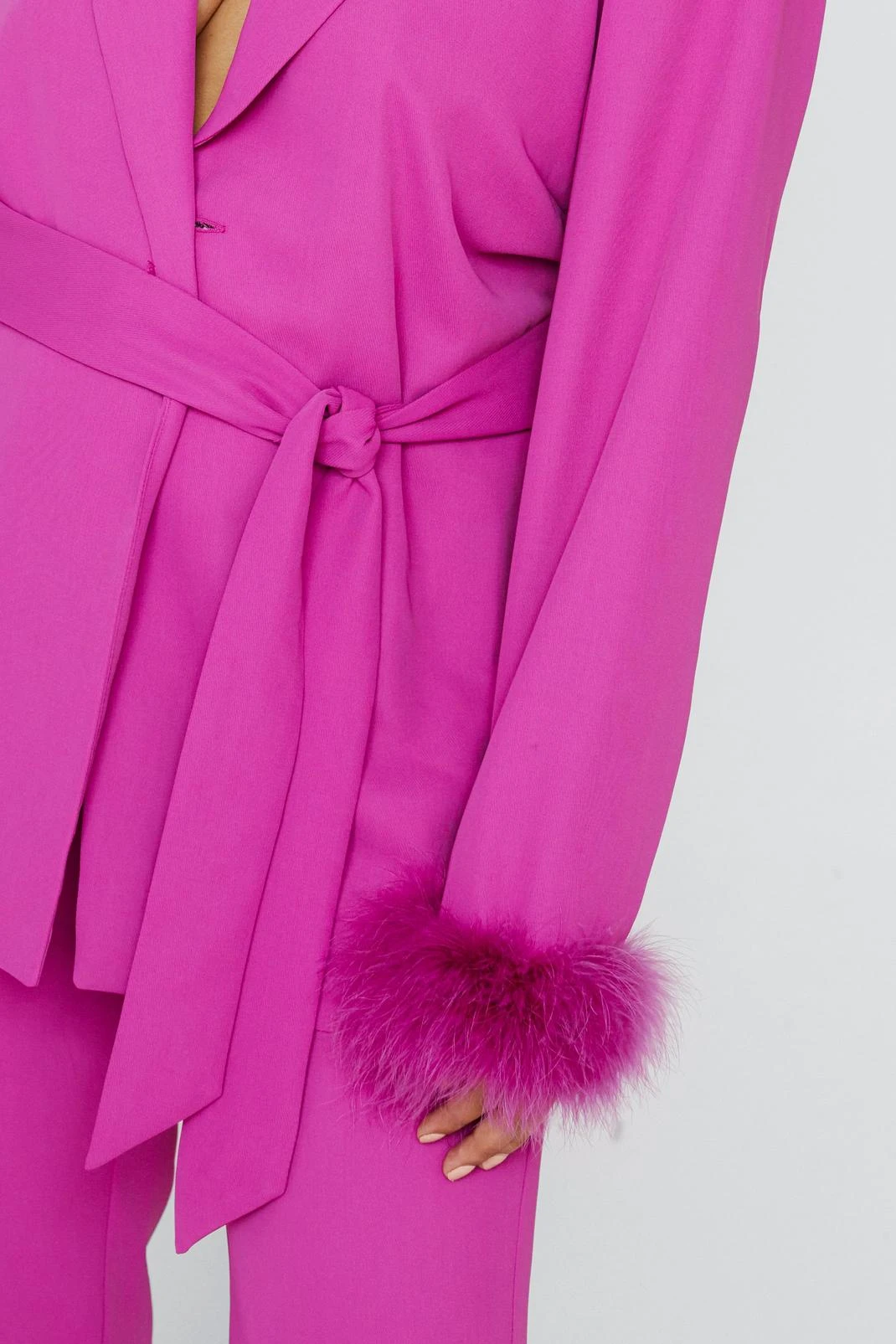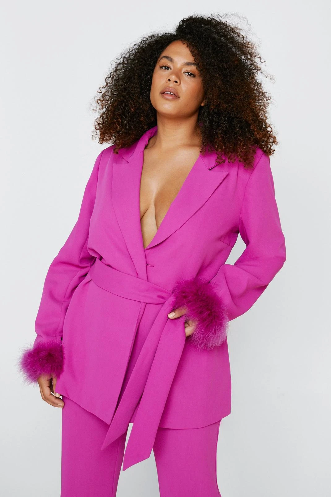 - Plus Size Belted Blazer With Feather Cuffs