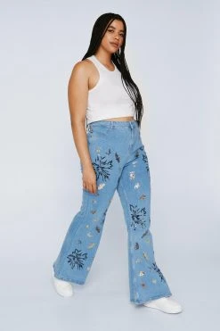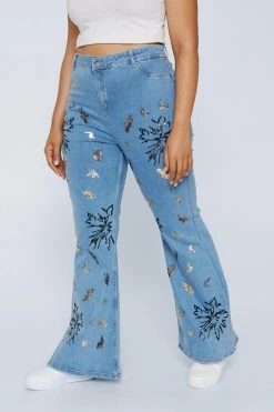Denim dreams. Style our embroidered flare jeans with a crop top and leather jacket.