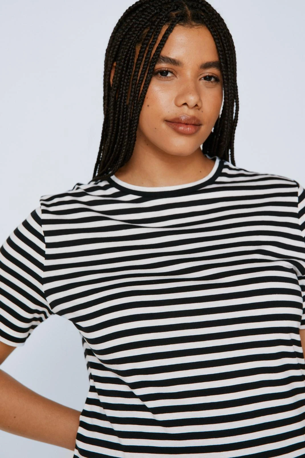 Build your basics. Our plus size short sleeved stripe t-shirt looks great with leather shorts or pants.