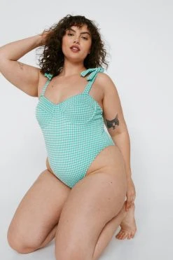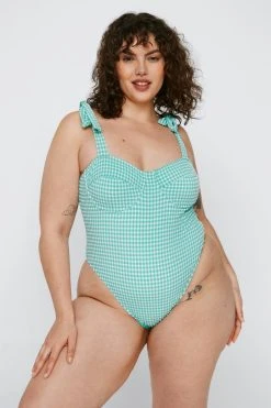 - Plus Size Textured Gingham Print Swimsuit