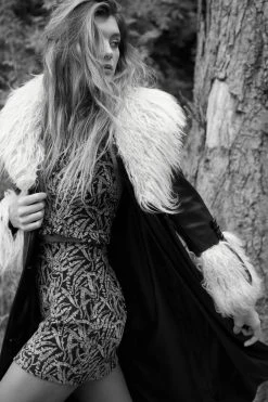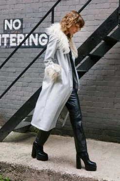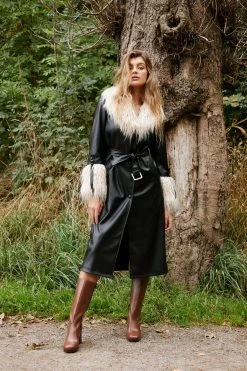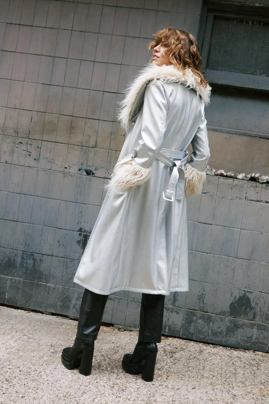 Add a layer. Feel fierce in our trench coat, made with high quality faux fur, with a cinched belted waist in a cozy longline design. Pairs well with leather pants and a blouse for a look that will take you from office days to date ngiht, dinner and drinks.