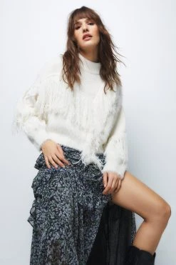 Talking texture. Cozy up as the cold weather draws in in our premium high neck fringe sweater.